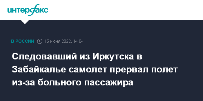 Москва. 15 июня. INTERFAX.RU - Самолету Ан-26 авиакомпании "ИрАэро", летевшему в среду из Иркутска в село Чара Забайкальского края, пришлось прервать полет из-за ухудшения самочувствия одного из пассажиров, сообщили "Интерфаксу" в пресс-службе "ИрАэро".