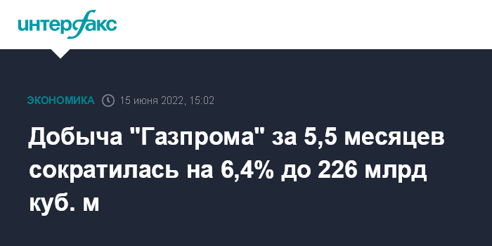 Москва. 15 июня. INTERFAX.RU - "Газпром" с 1 января по 15 июня 2022 года, по предварительным данным, добыл 226 млрд куб. м газа, что на 6,4% (на 15,5 млрд куб. м) меньше, чем в прошлом году, сообщает компания.