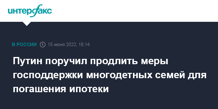 Москва. 15 июня. INTERFAX.RU - Президент РФ Владимир Путин поручил правительству продлить меры господдержки многодетных семей для погашения ипотеки в размере 450 тысяч рублей.