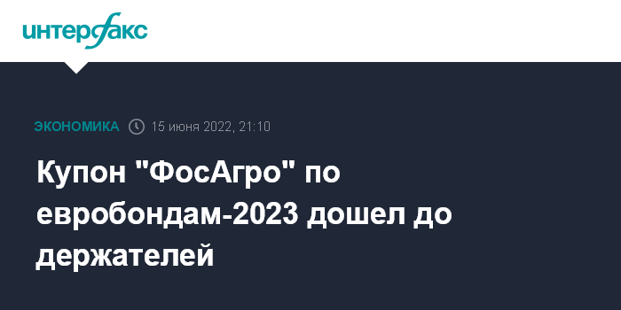 Москва. 15 июня. INTERFAX.RU - Купонный платеж по евробондам "ФосАгро" на $500 млн с погашением в 2023 году, выплата которого была заблокирована в апреле, дошел до держателей.
