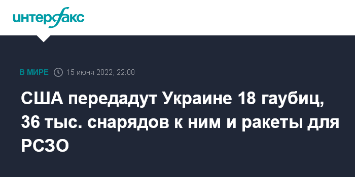 Москва. 15 июня. INTERFAX.RU - Пакет военной помощи США для Украины, о котором объявили в среду, предусматривает, в частности, передачу Вашингтоном еще 18 155-мм гаубиц и 36 тысяч снарядов для них, сообщают в среду американские СМИ со ссылкой на Пентагон.