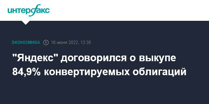 Москва. 16 июня. INTERFAX.RU - "Яндекс" финально договорился с держателями 84,9% конвертируемых облигаций на $1,25 млрд об их выкупе.
