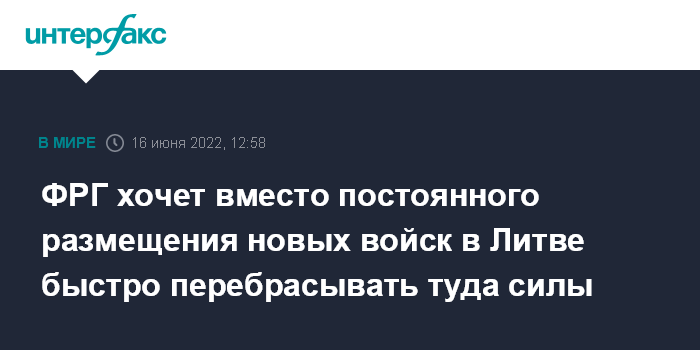 Москва. 16 июня. INTERFAX.RU - Планы командования Германии предусматривают вместо размещения на постоянной основе новых сил в Литве быструю переброску в случае необходимости в эту страну специально отобранных подразделений, сообщает в четверг Bloomberg.