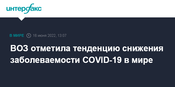 Москва. 16 июня. INTERFAX.RU - Уровень заболеваемости коронавирусом за прошедшую неделю продолжил снижаться, в то время как смертность увеличилась на 4%. Об этом говорится в еженедельном эпидемиологическом бюллетене Всемирной организации здравоохранения (ВОЗ).