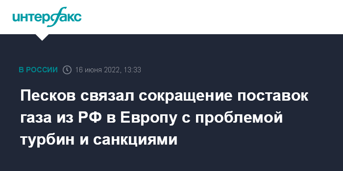 Москва. 16 июня. INTERFAX.RU - В Кремле заявили, что сокращение поставок российского газа ряду стран Европы связано с проблемой капремонта турбин и является следствием антироссийских санкций.