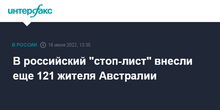"В ответ на расширяющиеся санкции правительства Австралии, которые распространяются на все большее число граждан России - как официальных лиц и членов их семей, так и представителей деловых кругов и средств массовой информации - в российский "стоп-лист" дополнительно вносится 121 австралиец из числа руководителей силовых структур, бизнесменов, экспертов и журналистов, формирующих в этой стране русофобскую повестку дня", - говорится в заявлении российского внешнеполитического ведомства.
