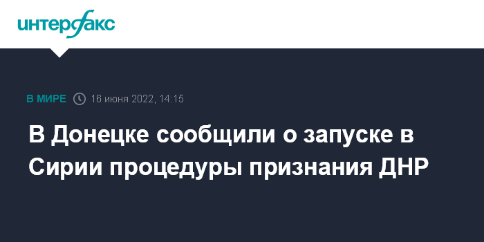 Москва. 16 июня. INTERFAX.RU - Президент Сирии Башар Асад запустил процедуру официального признания ДНР, сообщил МИД Донецкой народной республики.
