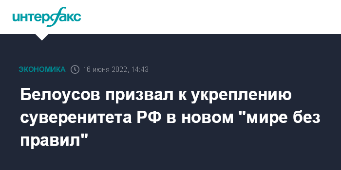 "Вот эта череда кризисов, которые развертываются на наших глазах. А с другой стороны, мы имеем не просто санкции. Санкции были, есть и, думаю, будут. Мы имеем колоссальный кризис доверия в мире. Самый болезненный удар, который нанесли санкции по всем странам без исключения, - это то, что они показали, что никаких правил не существует. Вообще никаких правил. У кого кольт - тот и сильный. Вот единственное правило. (...) Если фундамент доверия пробивается, то начинается мир без правил. А мир без правил - это что, это война. По сути это война. Экономическая война, политическая война, какая угодно", - сказал Белоусов.