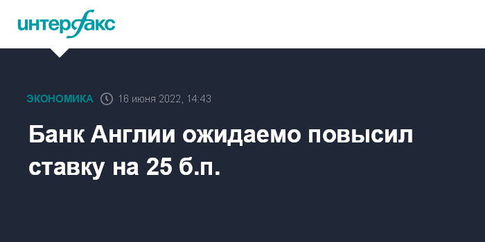 Москва. 16 июня. INTERFAX.RU - Банк Англии по итогам июньского заседания принял решение повысить базовую процентную ставку до 1,25% с 1%, как и ожидало большинство аналитиков и экономистов.