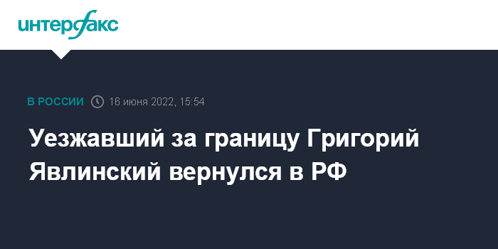 Москва. 16 июня. INTERFAX.RU - Основатель партии "Яблоко" Григорий Явлинский вернулся в Москву из отпуска. Об этом говорится в сообщении партии, опубликованном в телеграм-канале "Яблока" в четверг.
