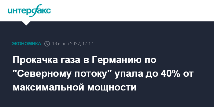 Москва. 16 июня. INTERFAX.RU - Федеральное сетевое агентство Германии сообщило о сокращении прокачки газа по газопроводу "Северный поток" в Германию.