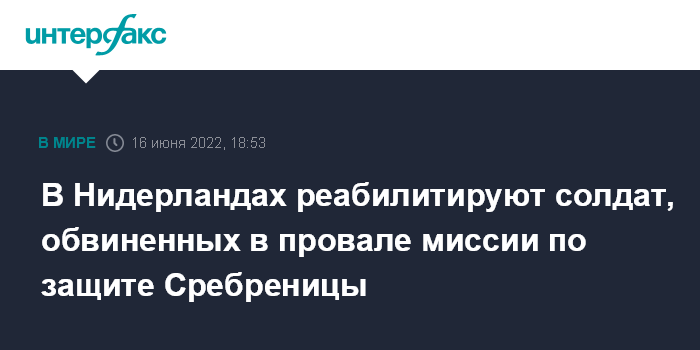 Москва. 16 июня. INTERFAX.RU - Кабинет министров Нидерландов на выходных проведет встречу с ветеранами боснийской войны, которые работали там под эгидой ООН, и, вероятно, начнет реабилитацию батальона, обвиненного много лет назад в неспособности защитить Сребреницу, сообщает в четверг портал Dutch News.