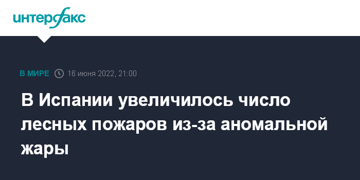 Москва. 16 июня. INTERFAX.RU - Количество природных пожаров значительно увеличилось за последние несколько дней в Испании на фоне сильной жары, сообщают европейские СМИ.
