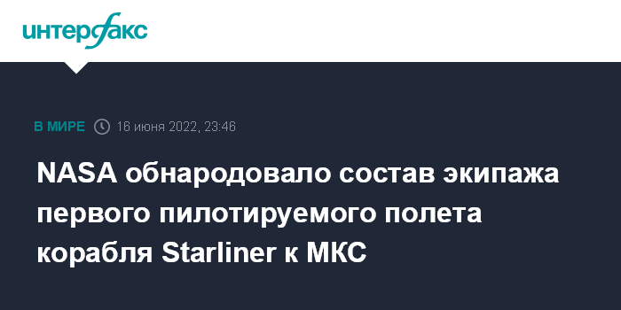 "Командир миссии CFT Барри Уилмор, назначенный NASA в основной экипаж в октябре 2020, присоединится к астронавту управления Суни Уильямс, которая будет исполнять обязанности пилота", - говорится в сообщении американского космического ведомства.
