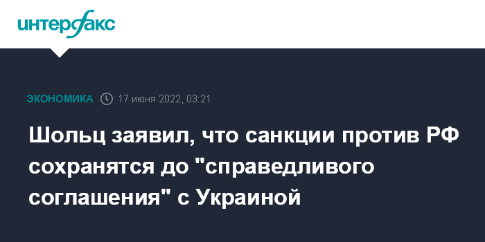 Москва. 17 июня. INTERFAX.RU - Санкции, введенные против России в связи с ситуацией вокруг Украины, будут действовать до тех пор, пока Москва не достигнет "справедливого соглашения" с Киевом, заявил канцлер Германии Олаф Шольц в интервью телеканалу ZDF.