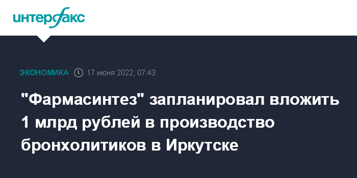Москва. 17 июня. INTERFAX.RU - АО "Фармасинтез" (Иркутск, управляющая компания группы "Фармасинтез") планирует вложить 1 млрд рублей в создание в Иркутске производства бронхолитиков, сообщила в пятницу пресс-служба правительства Иркутской области.
