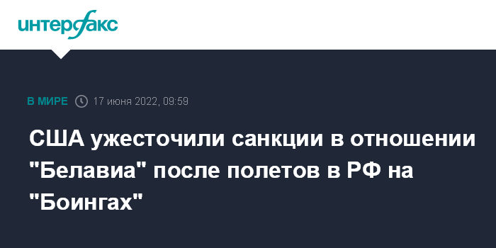 Москва. 17 июня. INTERFAX.RU - Министерство торговли США через свое Бюро промышленности и безопасности (BIS) ужесточило сроком на 180 дней санкции в отношении белорусской национальной авиакомпании "Белавиа" из-за нарушения введенных в апреле мер экспортного контроля, говорится в приказе, опубликованном на сайте министерства.