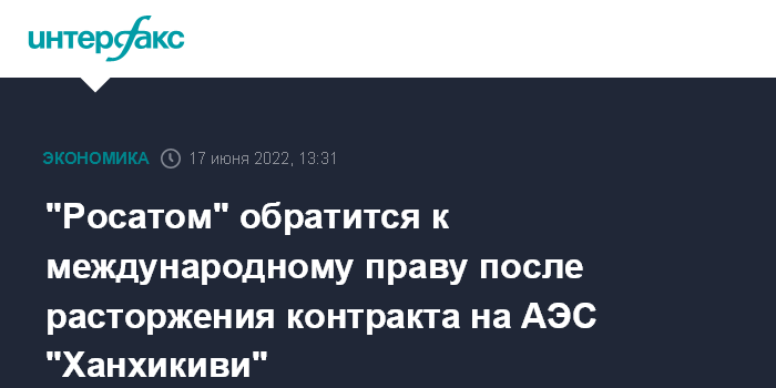 Москва. 17 июня. INTERFAX.RU - Госкорпорация "Росатом" планирует апеллировать к контрактным механизмам и международному праву после расторжения контракта на строительство АЭС "Ханхикиви" в Финляндии, сообщил глава компании Алексей Лихачев на ПМЭФ.