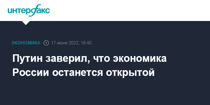 Москва. 17 июня. INTERFAX.RU - Россия никогда не пойдет по пути самоизоляции, ее экономика останется открытой, заявил президент РФ Владимир Путин.