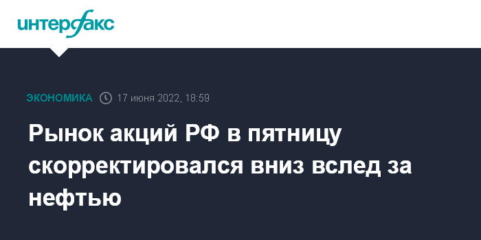 Москва. 17 июня. INTERFAX.RU - Рынок акций РФ в пятницу скорректировался вниз вслед за подешевевшей нефтью, также игроки фиксировали прибыль после недельного роста и оценивали выступление президента РФ Владимира Путина на Петербургском международном экономическом форуме (ПМЭФ-2022). Внешние фондовые площадки немного подросли после обвала из-за ужесточения монетарной политики Федрезервом США.