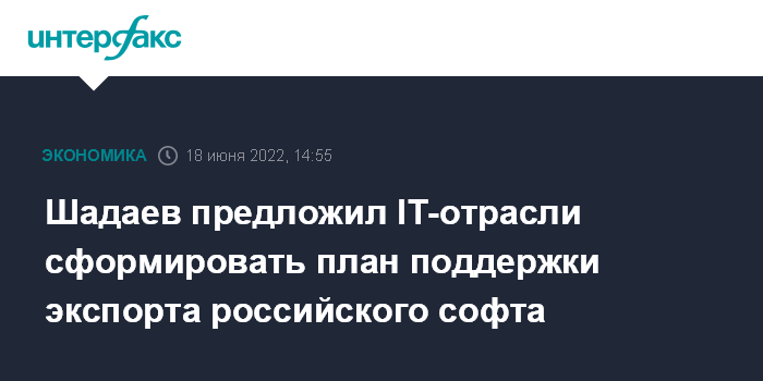 Москва. 18 июня. INTERFAX.RU - Глава Минцифры РФ Максут Шадаев считает необходимым наращивание экспорта российского ПО в дружественные страны и попросил участников отрасли за лето сформировать план поддержки такого экспорта. Об этом министр заявил на бизнес-завтраке "IT-лидерство - альянс России и развивающегося мира" в рамках ПМЭФ-2022.