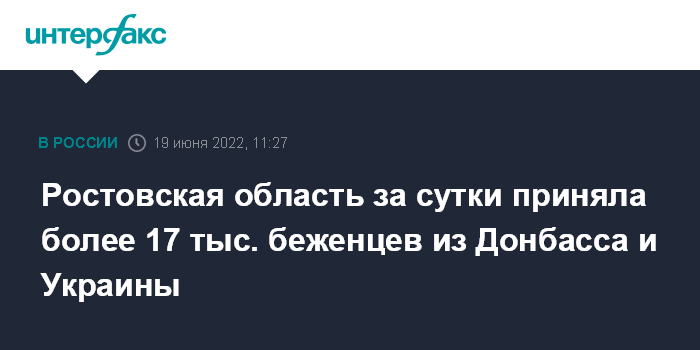 Москва. 19 июня. INTERFAX.RU - Более 17 тыс. беженцев с территорий Донбасса и Украины прибыли через пункты пропуска в Ростовскую область за минувшие сутки, сообщает в воскресенье пресс-служба регионального пограничного управления ФСБ России.