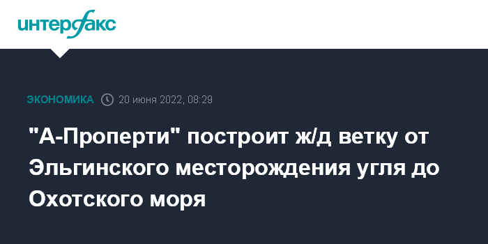 Москва. 20 июня. INTERFAX.RU - "А-Проперти" Альберта Авдоляна приняла положительное решение по вопросу строительства железнодорожной ветки от Эльгинского угольного месторождения до Чумикана (село, административный центр Тугуро-Чумиканского района Хабаровского края, порт на Удской губе Охотского моря). Как пишет "Коммерсантъ", эту информацию ему подтвердили в компании, отметив также, что строительство будет вестись целиком за собственные средства.