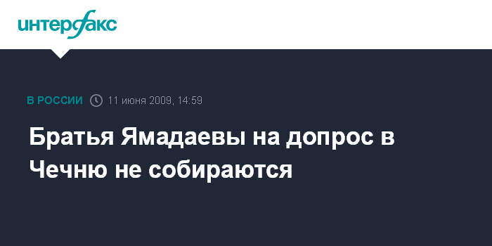 Москва. 11 июня. INTERFAX.RU - Братья экс-командира батальона ГРУ "Восток" Сулима Ямадаева - Иса и Муса Ямадаевы не поедут на принудительный допрос в Чечню, сообщил "Интерфаксу" в четверг их адвокат Алексей Спиридонов.