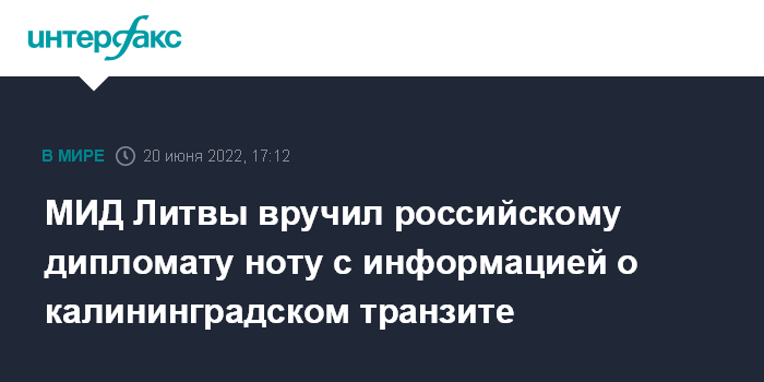 В МИД РФ "заявили в этой связи, что если в ближайшее время грузовой транзит между Калининградской областью и остальной территорией Российской Федерации через Литву не будет восстановлен в полном объеме, то Россия оставляет за собой право на действия по защите своих национальных интересов".