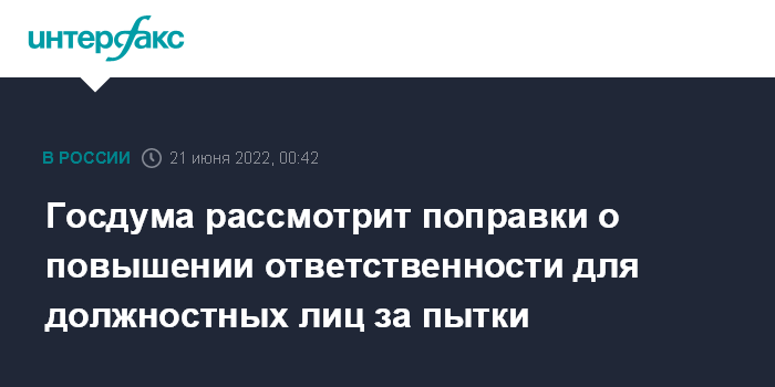 Москва. 21 июня. INTERFAX.RU - Госдума во вторник рассмотрит во втором чтении проект закона об уголовной ответственности для должностных лиц за пытки.