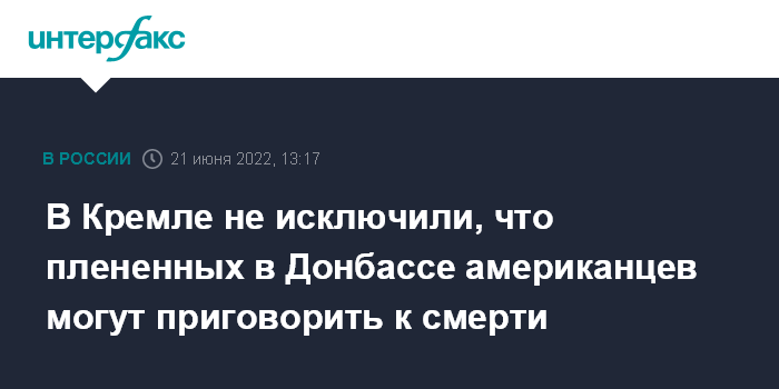 Москва. 21 июня. INTERFAX.RU - В Кремле заявили, что не могут уточнить местонахождение двух граждан США, плененных в зоне боевых действий в Донбассе, поскольку не располагают такими данными, там также не исключили, что этих американцев могут приговорить к смертной казни.