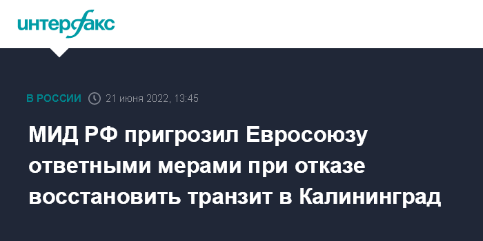 Москва. 21 июня. INTERFAX.RU - Российская сторона потребовала от Евросоюза восстановления нормального функционирования транзита между Калининградом и остальной территорией РФ, пригрозила ответными мерами, сообщили во вторник в МИД России.