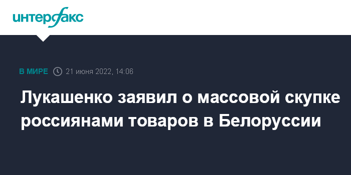 Москва. 21 июня. INTERFAX.RU - Президент Белоруссии Александр Лукашенко заявил, что граждане России массово скупают товары в Белоруссии, и цены на продукты за рубежом подскочили, считает, что это является возможностью для сельского хозяйства страны неплохо заработать.