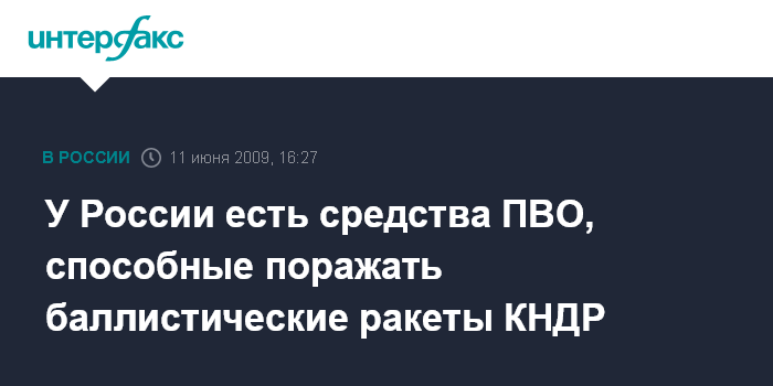 Москва. 11 июня. INTERFAX.RU - Развернутые на Дальнем Востоке современные российские средства противовоздушной обороны в состоянии эффективно поражать при необходимости северокорейские баллистические ракеты, заявил "Интерфаксу-АВН" в четверг в Москве заместитель начальника Генштаба генерал-полковник Анатолий Ноговицын.