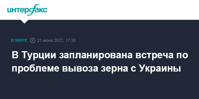Москва. 21 июня. INTERFAX.RU - Переговоры с целью организовать процесс вывоза зерна с Украины запланированы на ближайшее время в Стамбуле, сообщает во вторник Bloomberg.