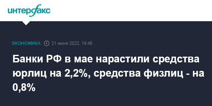 Банки РФ в мае нарастили средства юрлиц на 2,2%, средства физлиц - на 0,8%