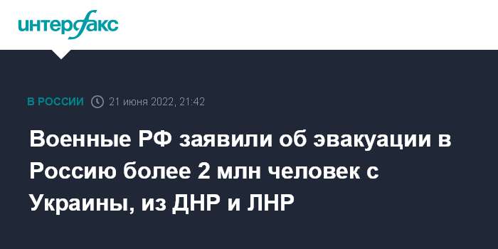 Москва. 21 июня. INTERFAX.RU - В ходе специальной военной операции на территорию России из Донецкой и Луганской народных республик, а также украинских населённых пунктов вывезены более двух миллионов человек, сообщил начальник Национального центра управления обороной РФ Михаил Мизинцев на брифинге во вторник.