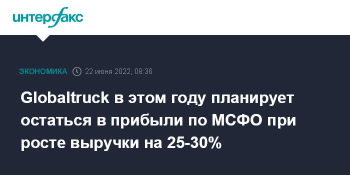 Москва. 22 июня. INTERFAX.RU - Автомобильный грузоперевозчик Globaltruck (ПАО "Глобалтрак менеджмент", ГТМ) планирует увеличить выручку по МСФО в 2022 году на 25-30%, оставшись прибыльным, сообщил в интервью "Интерфаксу" гендиректор группы Илья Саттаров.