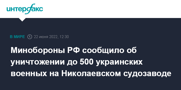 "21 июня в результате удара высокоточным оружием ВКС России уничтожено до 500 военнослужащих 59-й механизированной бригады ВСУ с вооружением и военной техникой, размещавшихся в цехах Николаевского судостроительного завода "Океан", - сказал Конашенков на брифинге в среду.