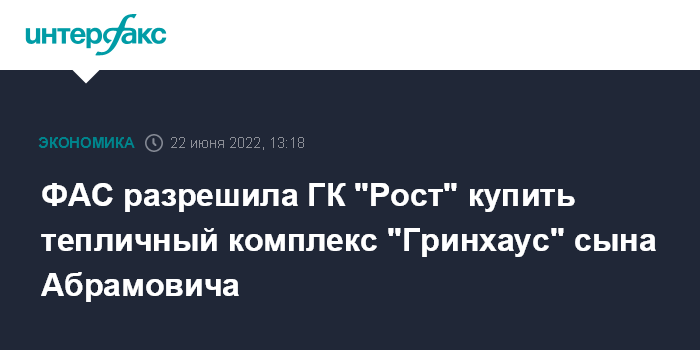 ФАС разрешила ГК "Рост" купить тепличный комплекс "Гринхаус" сына Абрамовича