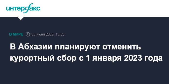 Москва. 22 июня. INTERFAX.RU - Курортный сбор будет отменен в Абхазии с 1 января 2023 года, соответствующий законопроект приняли в среду депутаты парламента республики в первом чтении.