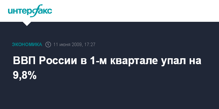 Москва. 11 июня. INTERFAX.RU - Индекс физического объема валового внутреннего продукта в 1-м квартале 2009 года относительно соответствующего периода 2008 г., по пересмотренной оценке Росстата, составил 90,2%. Ранее Росстат оценивал уменьшение ВВП в 1-м квартале на 9,5%.
