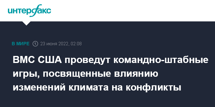 Москва. 23 июня. INTERFAX.RU - ВМС США намерены на следующей неделе провести командно-штабные военные игры с целью понять, как климатические изменения могут повлиять на конфликты в будущем, сообщает The Hill.