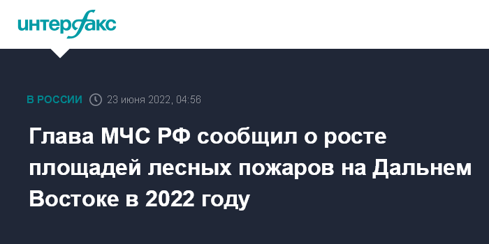 Москва. 23 июня. INTERFAX.RU - Глава МЧС России Александр Куренков сообщил о росте площадей лесных пожаров на Дальнем Востоке в 2022 году и призвал принять эффективные меры для их предотвращения и ликвидации последствий.