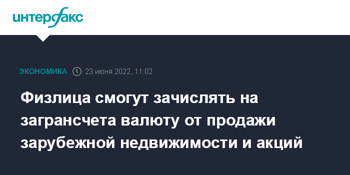 Москва. 23 июня. INTERFAX.RU - Подкомиссия правительственной комиссии по контролю за осуществлением иностранных инвестиций разрешила резидентам-физлицам зачислять на свои счета в банках и иных организациях финрынка, расположенных за пределами РФ, средства в иностранной валюте, полученные от нерезидентов от продажи недвижимости, находящейся не в России.