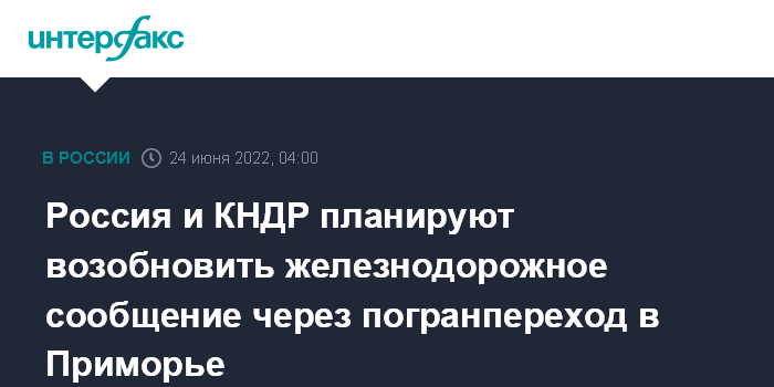 Москва. 24 июня. INTERFAX.RU - Россия и КНДР планируют возобновить прерванное из-за пандемии железнодорожное сообщение через пограничный переход Хасан (Приморский край) - Туманган (КНДР), сообщила пресс-служба Минвостокразвития.