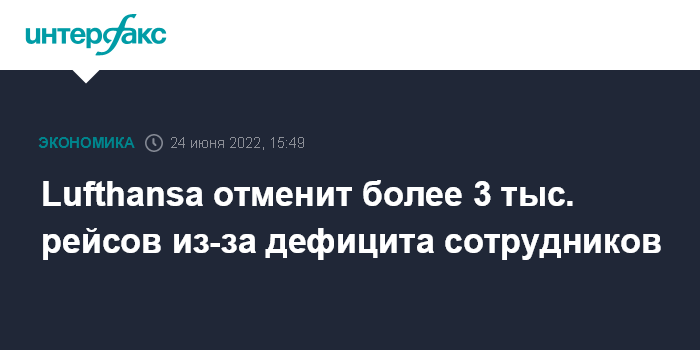 Москва. 24 июня. INTERFAX.RU - Deutsche Lufthansa AG отменит в общей сложности порядка 3,1 тысячи рейсов в летние месяцы в связи с нехваткой сотрудников из-за пандемии COVID-19.