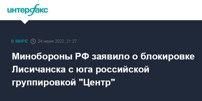 Москва. 24 июня. INTERFAX.RU - Российская группировка "Центр" под командованием генерал-полковника Александра Лапина прорвала оборону украинской армии и блокировала город Лисичанск с юга, сообщил официальный представитель Минобороны РФ Игорь Конашенков.