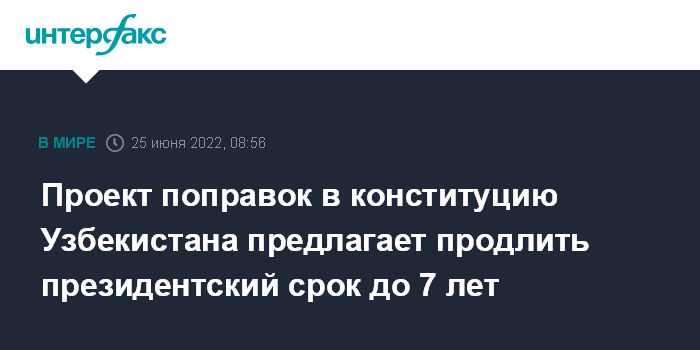 Москва. 25 июня. INTERFAX.RU - Проект Конституционного закона Республики Узбекистан "О внесении изменений и дополнений в конституцию Республики Узбекистан", в котором есть пункт об увеличении президентского срока с пяти до семи лет, опубликован в парламентских изданиях страны в субботу для всенародного обсуждения.