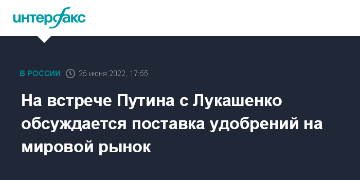 Москва. 25 июня. INTERFAX.RU - Президент РФ Владимир Путин обсуждает с президентом Белоруссии Александром Лукашенко тему поставок удобрений на мировой рынок.